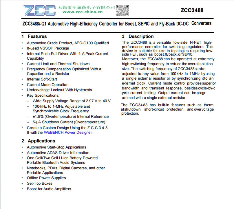 1特点 汽车级产品,AEC-Q100合格 8-引脚VSSOP封装 具有1-A峰值电流能力的内部推挽式驱动器 电流限制和热关闭 利用电容和电阻优化频率补偿 内部软启动 当前模式操作 带滞后的欠压锁定 主要规格: -宽电源电 ...
