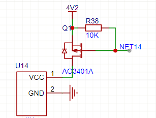 | 按照你的图分析你的MOS 管G受上拉10K电阻必然导通,MOS的导通与回路是否接负载无关,此时你回路接了单片机VCC,那么VCC就是4V2减去MOS压降 |