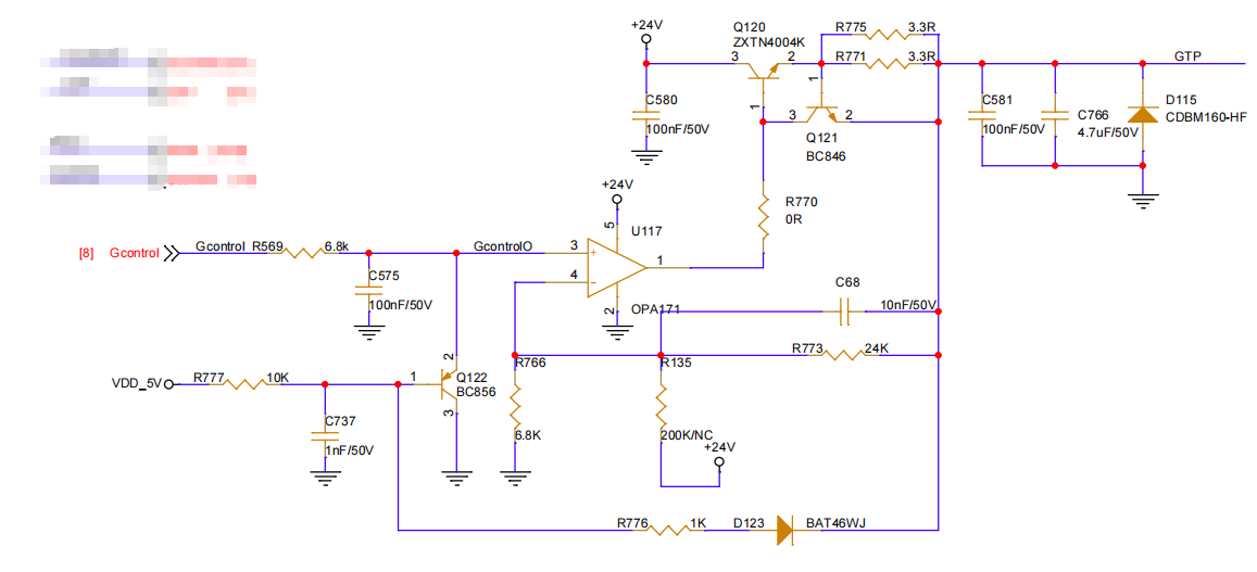 aidianzi 发表于 2025-9-22 17:12 你好,感谢的您的解答,还有以下几点疑惑: (1)放大路径是否是从U117的1脚-到Q120的1-Q120的2- R775&771-到R773-到R766, 属于同相比例放大,根据计算公式是否为V= 1+(24K+1.65)/6.8K=4.5倍 所以输出约是5*4.5=22.5V 是否有误? (2)Q120的3脚接+24V 是否会对GTP的输出有影响?因为正常工作Q120应该是导通的; (3)有VDD_5V的供电,它在电路中起到什么作用?运放工作时由于D123的存在应该是不导通的 ,运放不导通时,不是会和电阻R766和R773形成分压的回路,影响GTP的输出 |