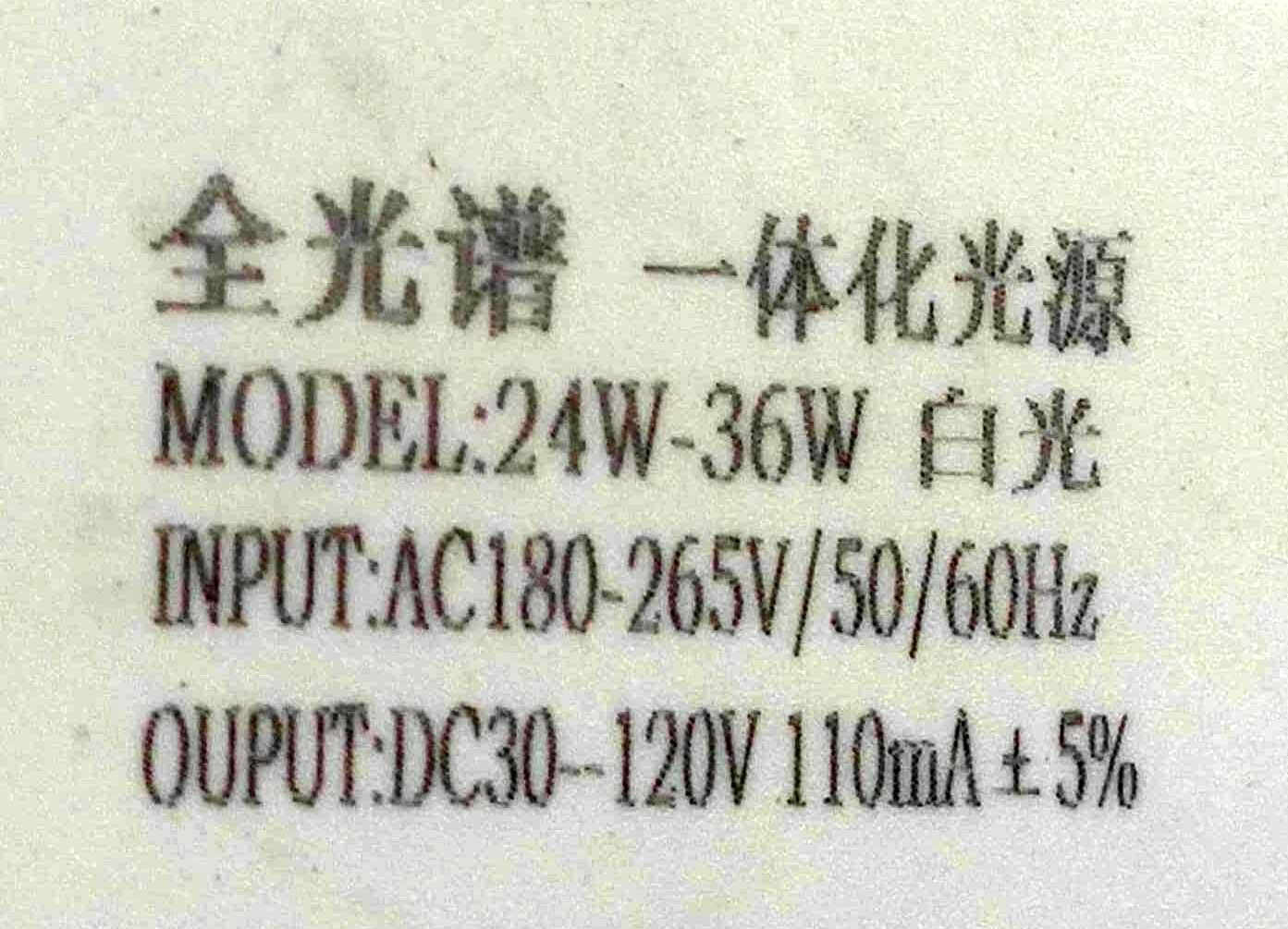 MODEL:24W-36W 是型号:24W-36W 不是功率 OUPUT:DC30-120V 110mA 算下应该最高120V*110mA 13.2W 这个产品不是太正规 ![]() |