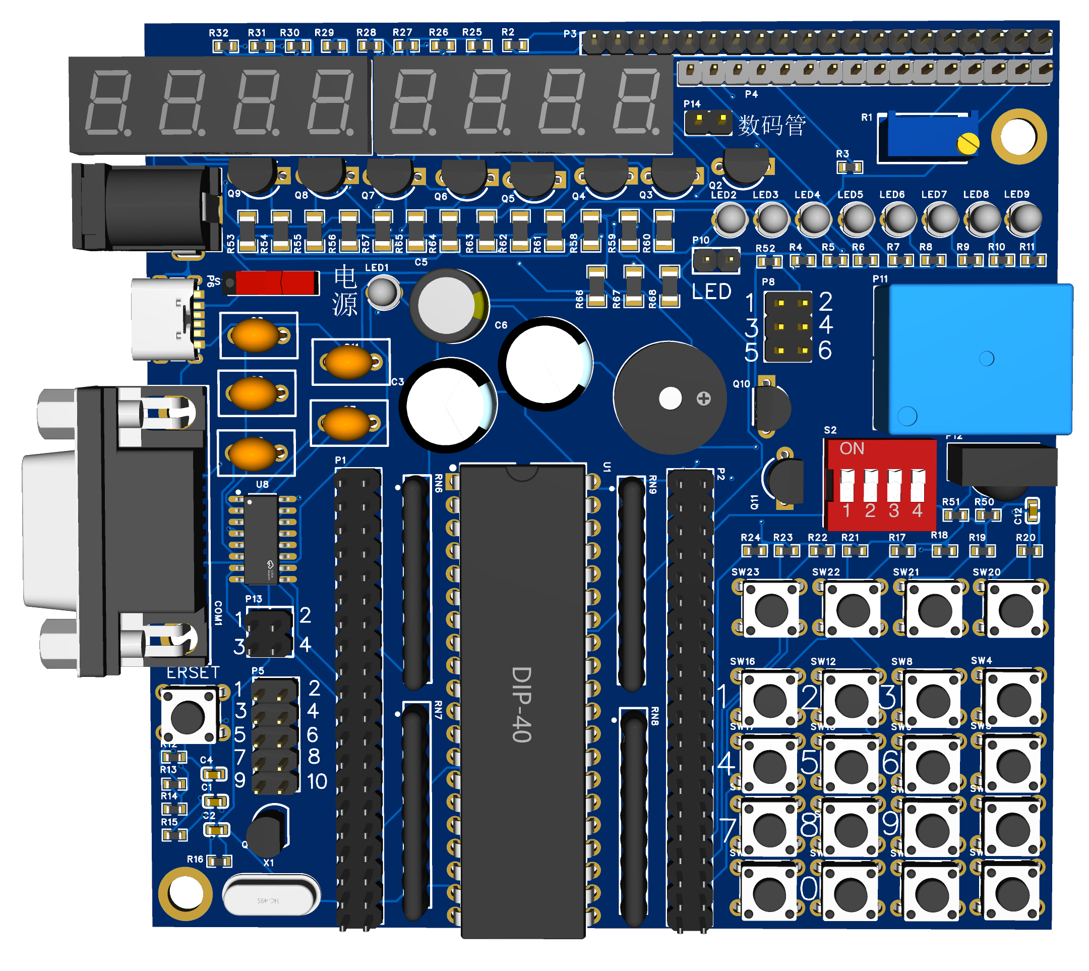本帖最后由 小小张。。 于 2025-10-31 21:28 编辑 配有指示灯、开关的5V供电电路(USB供电和适配器供电); 经过滤波的复位电路; 11.0592MHz晶体振荡器; 8路发光二极管流水灯; 2片4位高亮数码管,共计8 ...