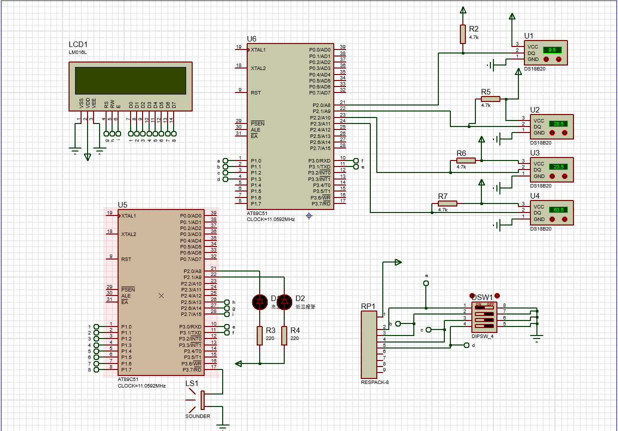 | 在没有充分经验的前提下不要试图直接设计复杂的应用。可以先设计单个DS18B20的测温LCD1602显示系统。调试成功后再扩展为多个DS18B20分布式温度测量系统,既可以采用单总线分布式方式也可以采用各自独立的分布方式。在此基础上调通后再拆分为主从机。无非就是将本系统显示缓存中的数据通过串口在另一个系统中显示。只要按上述步骤逐一调通,其实没有什么难度。 |