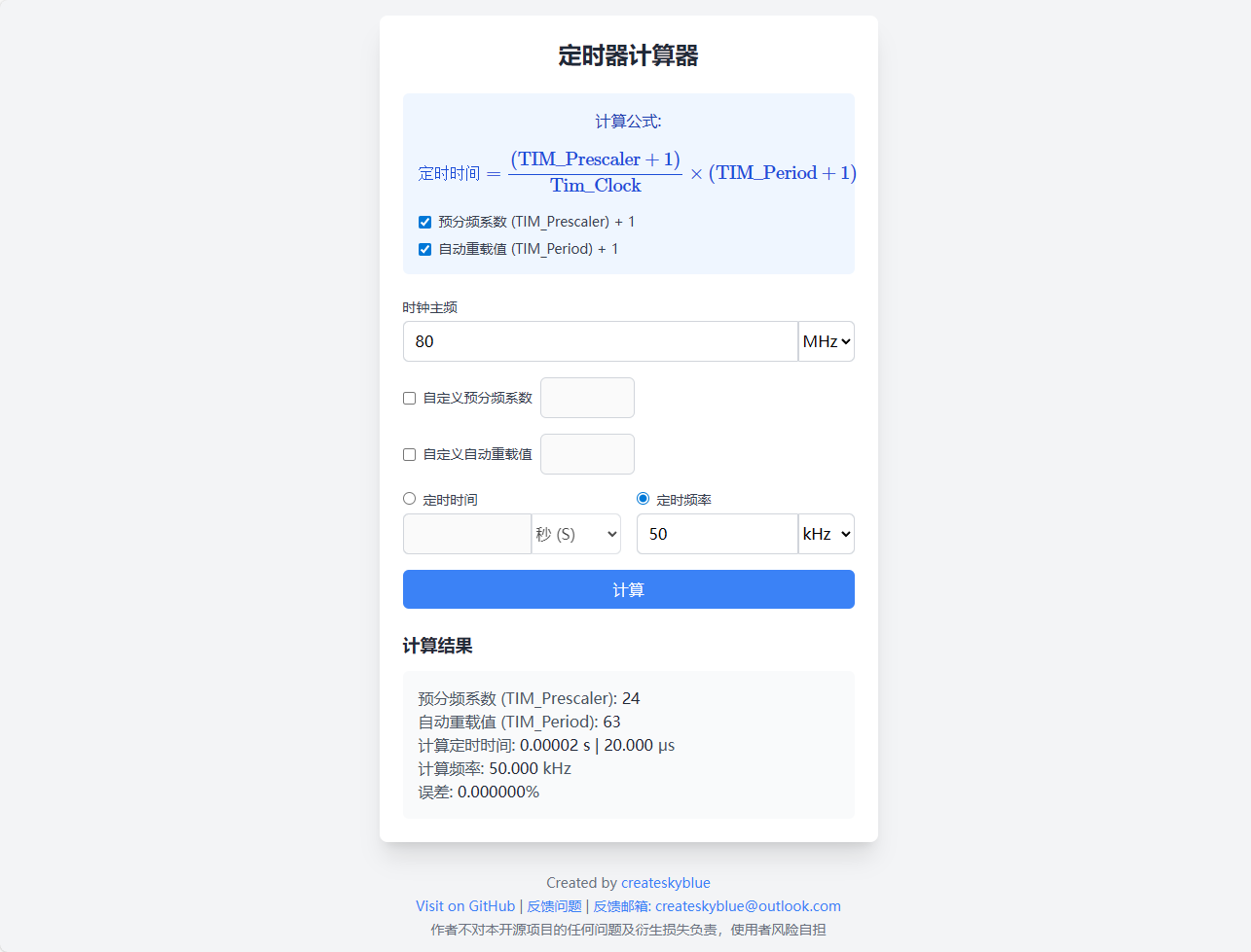 定时器计算器 这是一个用于计算嵌入式系统定时器参数的工具,可以帮助开发者快速确定预分频系数(TIM_Prescaler)和自动重载值(TIM_Period)以达到目标定时时间或频率。功能特点 基本计算功能 根据目标定时 ...