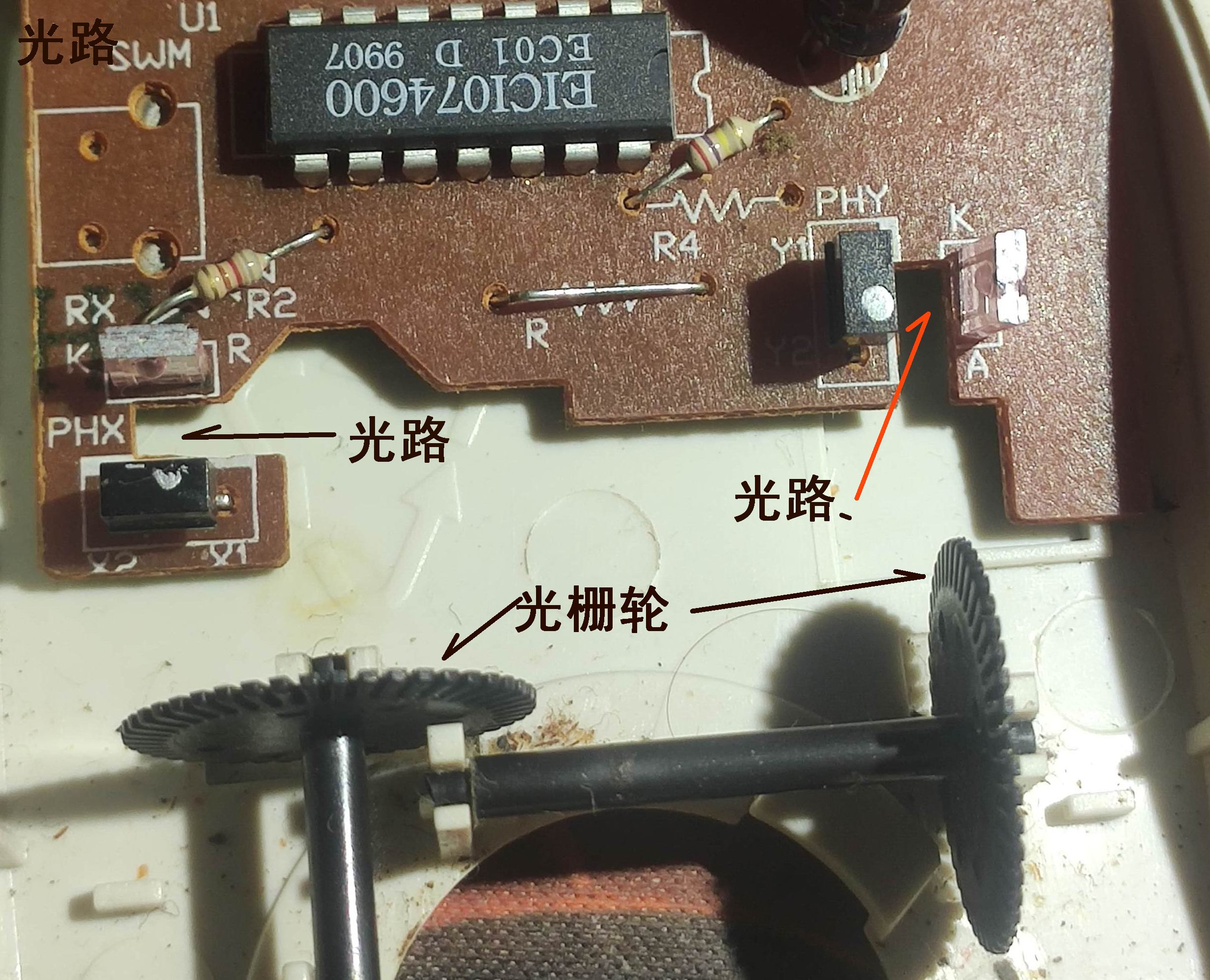 本帖最后由 海阔天空8 于 2026-1-27 08:40 编辑 光栅轮在光路中切断光信号的次数和速度就产生的一系列脉冲信号,鼠标底部摩擦球和光栅轮轴的摩擦完成光栅轮的转动。有的鼠标里面有3个微动开关,这个没有?