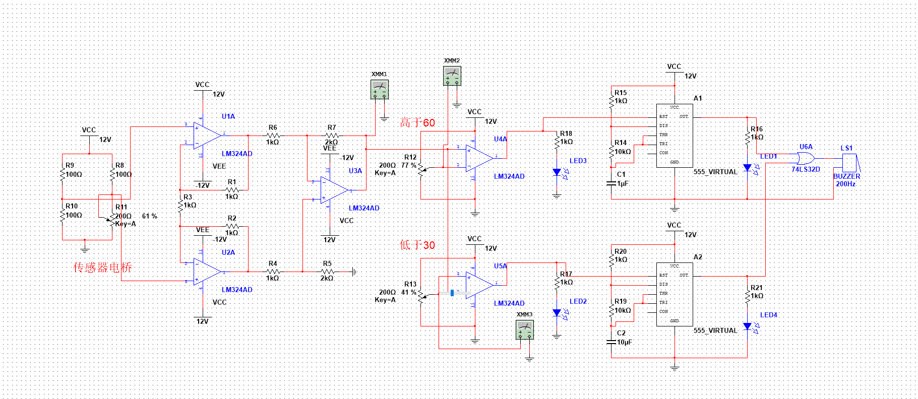 6、温度报警器设计:当温度在30°C至60°C范围内时报警器不发声响,当温度超过这个 范围时,报警器发出声响,并根据不同音调区分温度的高低,即:当温度高于60℃时,报 警器发出不同的声音。