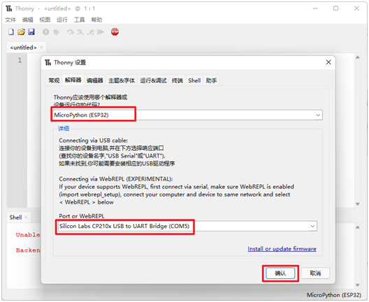 本帖最后由 hxjlmhyt 于 2026-2-17 22:35 编辑 5、 开始用Thonny连接ESP32模块在Thonny进行简单设置,点击菜单栏“运行”-在打开的菜单里选择“配置解释器”选择“解释器” ...