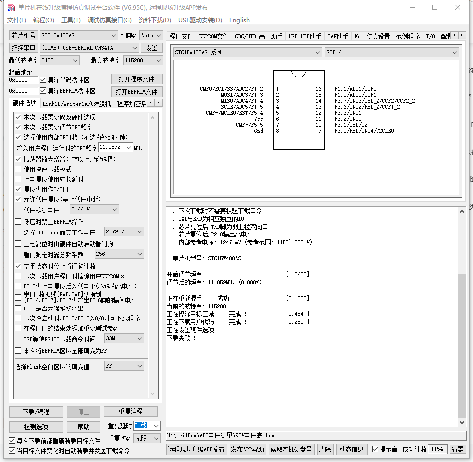 最大的可能是 电压不够。STC15W 系列虽然是宽电压,可以在3V以下工作,但是烧录时的电压必须高于4.3V,否则会烧录失败。 |