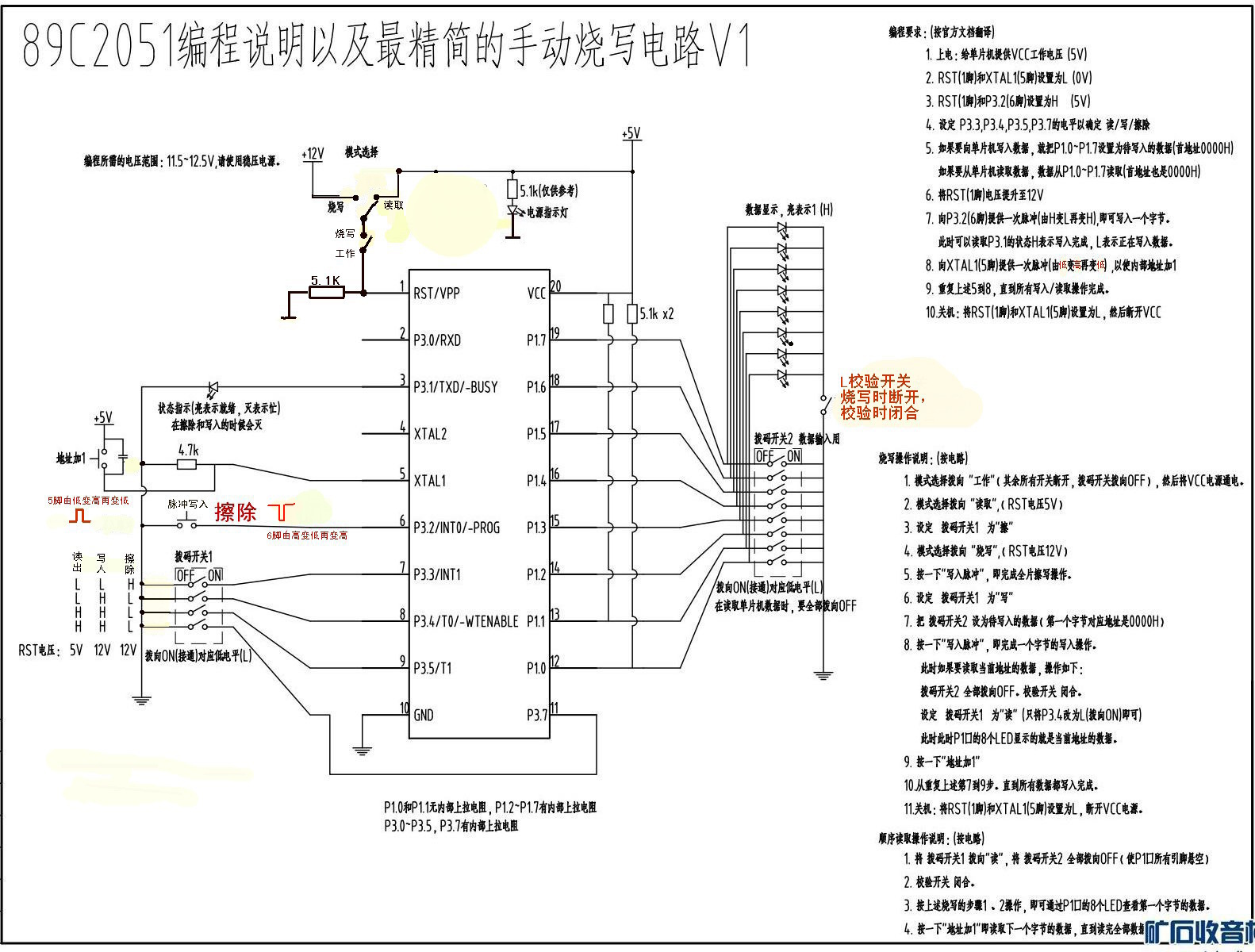 ldasta 发表于 2026-3-7 02:45 不是的,他已经会手动烧写了,只是他对自己在干啥还缺乏足够的认知。 关于手动编程,他最初是看了“89C2051的手动编程_吴伟江”这个文章(见附件) 文章介绍的是个半自动的烧录器,用了555还有几个数字逻辑芯片,线路其实比较复杂的,他没做。 然后我给他画了最简手动编程电路 (见附件)。里面切换烧录,校验,地址以及脉冲输入等操作,全都是人工用实物开关完成。 然后他就用那个最简手动编程电路,把他自己随意编的数据写进单片机了,然后还能读出来,读出来是用8个LED显示。 如果他写进去的是单片机能运行的固件,那就是正常的单片机烧录了。 目前他一直在“编程”(烧录和校验)这个环节转圈圈,单片机对他来说还是个黑盒子。