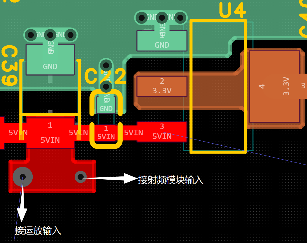 如题,画的板子上有一个5V射频模块、一个5V运放和一个5V-AMS1117,5V输入接22UF钽电容+100nf贴片电容做滤波,现在是将100nf贴片接到AMS1117给单片机供电,22uf连接一个大铜皮,在铜皮上打两个过孔,一个过孔接5V射频 ...
