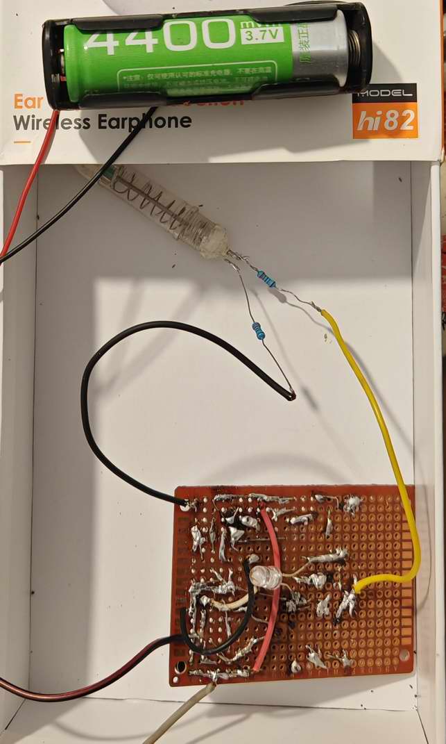 用圆珠笔筒制作了一个放电管,经试验在740V下遇到高能射线就能放电。