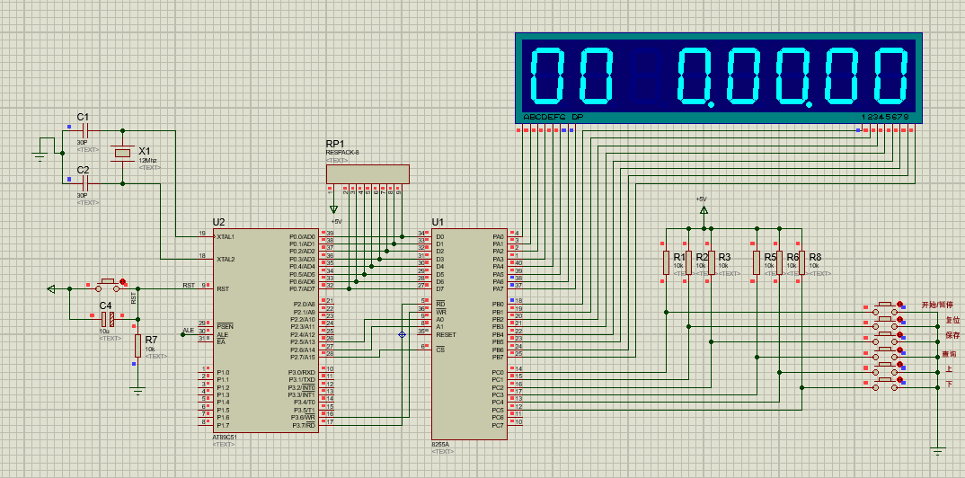 | #include <reg51.h> #include <absacc.h> // 8255端口地址定义(基于P2.5=A0, P2.6=A1, P2.7=CS,低有效) #define PA8255 XBYTE[0x0000] // A口:P2.7=0, P2.6=0, P2.5=0 #define PB8255 XBYTE[0x2000] // B口:P2.7=0, P2.6=0, P2.5=1 #define PC8255 XBYTE[0x4000] // C口:P2.7=0, P2.6=1, P2.5=0 #define COM8255 XBYTE[0x6000] // 控制口:P2.7=0, P2.6=1, P2.5=1 // 共阴极数码管段码表(0-9,空白) code unsigned char seg_code[] = { 0x3F, // 0 0x06, // 1 0x5B, // 2 0x4F, // 3 0x66, // 4 0x6D, // 5 0x7D, // 6 0x07, // 7 0x7F, // 8 0x6F, // 9 0x00 // 空白 }; // 按键位定义(PC0~PC5) #define KEY_START_PAUSE 0x01 #define KEY_RESET 0x02 #define KEY_SAVE 0x04 #define KEY_QUERY 0x08 #define KEY_PREV 0x10 #define KEY_NEXT 0x20 // 全局变量 unsigned long count = 0; // 改为long型,支持0~9分59.99秒,避免溢出 bit running = 0; // 计时运行标志 unsigned long record[10] = {0}; // 记录数组同步改为long型,保存分钟+秒信息 unsigned char record_count = 0; // 已存记录数(0~10) bit mode = 0; // 0=计时模式,1=查询模式 unsigned char query_index = 0; // 当前查询的记录索引(0~9) unsigned char display_buffer[8]; // 显示缓冲区 // 按键扫描相关 unsigned char key_prev = 0; bit key_scan_flag = 0; // 10ms扫描标志 // 定时器0中断服务程序(10ms) void timer0_isr(void) interrupt 1 { TH0 = 0xD8; // 12MHz,10ms初值 TL0 = 0xF0; if (running) { count++; // 取消99.99秒清零,累计为分钟,最大支持9分59.99秒 if (count >= 5999) {} } key_scan_flag = 1; // 通知主循环扫描按键 } // 定时器0初始化 void timer_init() { TMOD &= 0xF0; TMOD |= 0x01; // 定时器0,模式1 TH0 = 0xD8; TL0 = 0xF0; ET0 = 1; EA = 1; TR0 = 1; } // 更新显示缓冲区(核心修改:分钟位加分隔符,分·秒清晰区分) void update_display() { unsigned char i; unsigned char buf[8]; unsigned char minute; // 分钟(1位,0~9) unsigned int sec_total; // 剩余秒数(0~5999,对应00.00~59.99秒) unsigned int int_part, frac_part; // 秒的整数部分、小数部分 unsigned char tens, ones, tenths, hundredths; unsigned long val; for (i = 0; i < 8; i++) buf[i] = 0x00; // 先全灭 if (mode == 0) { // 计时模式 // 第1、2位:已存记录数(两位,不足补零) buf[0] = seg_code[record_count / 10]; buf[1] = seg_code[record_count % 10]; buf[2] = 0x00; // 第3位空白 // 计算分钟和剩余秒数 minute = count / 6000; // 6000个0.01秒=60秒=1分钟,取个位分钟 sec_total = count % 6000; // 剩余秒数(0~5999) // 拆分剩余秒数:整数部分(秒)=sec_total/100,小数部分=sec_total%100 int_part = sec_total / 100; frac_part = sec_total % 100; tens = int_part / 10; // 秒的十位(0~5) ones = int_part % 10; // 秒的个位(0~9) tenths = frac_part / 10; // 秒的十分位 hundredths = frac_part % 10;// 秒的百分位 // 第4~8位:分钟(1位+分隔符)+ 秒(99.99格式)【核心修改】 buf[3] = seg_code[minute] | 0x80; // 分钟位+右侧小数点(分隔符),分·秒 buf[4] = seg_code[tens]; // 第5位:秒十位 buf[5] = seg_code[ones] | 0x80; // 第6位:秒个位+小数点 buf[6] = seg_code[tenths]; // 第7位:秒十分位 buf[7] = seg_code[hundredths]; // 第8位:秒百分位 } else { // 查询模式【同步修改分钟位分隔符】 if (record_count > 0) { // 显示当前记录序号(从1开始) buf[0] = seg_code[(query_index + 1) / 10]; buf[1] = seg_code[(query_index + 1) % 10]; buf[2] = 0x00; // 显示记录值(同步支持分钟+分隔符) val = record[query_index]; minute = val / 6000; // 记录的分钟 sec_total = val % 6000; // 记录的剩余秒数 // 拆分剩余秒数 int_part = sec_total / 100; frac_part = sec_total % 100; tens = int_part / 10; ones = int_part % 10; tenths = frac_part / 10; hundredths = frac_part % 10; buf[3] = seg_code[minute] | 0x80; // 分钟位+分隔符(和计时模式一致) buf[4] = seg_code[tens]; buf[5] = seg_code[ones] | 0x80; buf[6] = seg_code[tenths]; buf[7] = seg_code[hundredths]; } else { // 如果没有记录,返回计时模式 mode = 0; } } // 复制到全局显示缓冲区 for (i = 0; i < 8; i++) display_buffer[i] = buf[i]; } // 动态扫描显示(位选低电平有效,无修改) void display() { unsigned char i; unsigned int j; for (i = 0; i < 8; i++) { PB8255 = 0xFF; // 消隐,关闭所有位 PA8255 = display_buffer[i]; // 送段码 PB8255 = ~(1 << i); // 选中第i位(i=0对应最左边) // 短暂延时 for (j = 0; j < 100; j++); } } // 按键扫描 void scan_key() { unsigned char key_current, key_down; unsigned char i; key_current = ~PC8255 & 0x3F; // 读PC0~PC5,取反得按下为1 key_down = key_current & (key_current ^ key_prev); key_prev = key_current; // 处理按键事件 if (key_down & KEY_START_PAUSE) { if (mode == 0) { running = !running; // 计时模式下开始/暂停 } } // 复位按键 if (key_down & KEY_RESET) { running = 0; // 停止计时 count = 0; // 清零当前值(分钟+秒都清零) if (mode == 1) { // 如果在查询模式,退出查询 mode = 0; } else { // 在计时模式下,清除所有记录 record_count = 0; for (i = 0; i < 10; i++) { record[i] = 0; } } } // 保存按键 if (key_down & KEY_SAVE) { if (mode == 0) { // 计时模式下保存 if (record_count < 10) { record[record_count] = count; // 保存当前count(含分钟信息) record_count++; } } else { // 查询模式下清除所有记录 record_count = 0; mode = 0; // 退出查询 } } // 查询按键 - 修改为点击一次直接进入查询模式 if (key_down & KEY_QUERY) { if (mode == 0) { // 当前在计时模式 if (record_count > 0) { // 有记录可查 mode = 1; // 直接切换到查询模式 query_index = 0; // 指向第一个记录 } } else { // 当前在查询模式 mode = 0; // 退出查询,返回计时模式 } } // 上一个按键 if (key_down & KEY_PREV) { if (mode == 1 && record_count > 0) { // 查询模式下切换上一个记录 if (query_index == 0) query_index = record_count - 1; else query_index--; } } // 下一个按键 if (key_down & KEY_NEXT) { if (mode == 1 && record_count > 0) { // 查询模式下