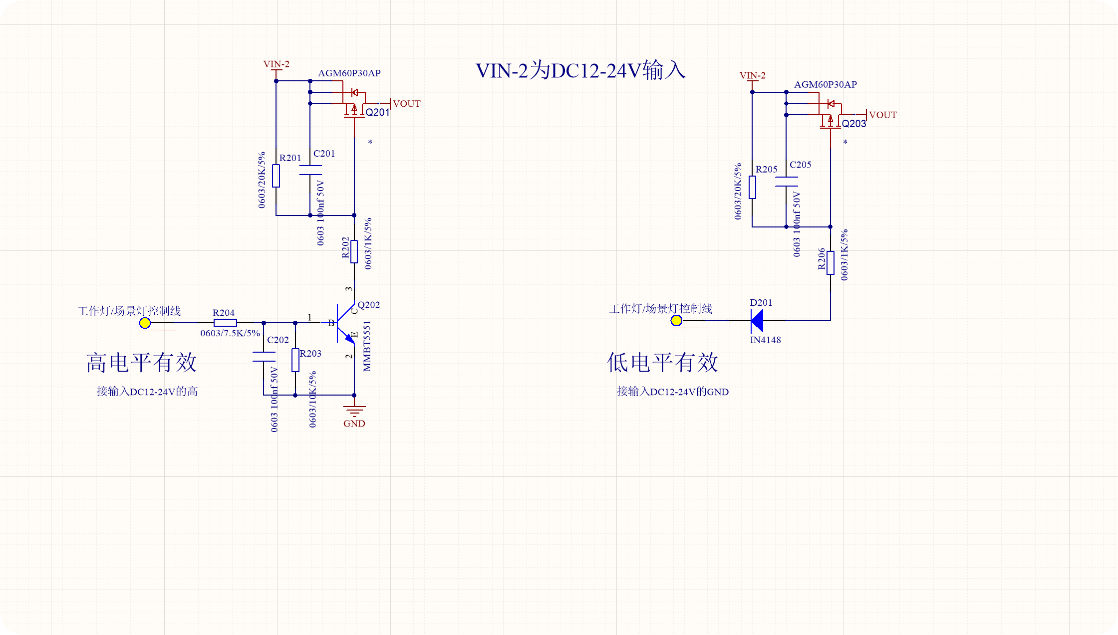 | 右边的低电平控制电路如果要可靠的工作的话,控制信号电平必须要在VIN-2和(VIN-2 - 12V)之间才行,电压过低可能关不掉 |