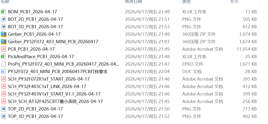 PCB 板如下(已打样验证): PY32F072_PY32F403_BOARD 最小系统板 , 合并10cm x 10cm 双面PCB打样,需要自己切割. 芯片 PY32F072R1 & ...