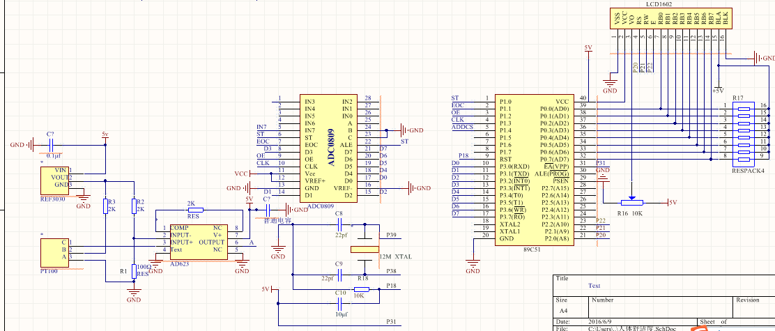本帖最后由 zl2168 于 2016-10-24 08:02 编辑 这个电路并不复杂。无非是传感器测温,信号运放放大,0809AD,1602显示。但电路连接未画好,例如运放输出端6应与0809IN7连接,另外传感器桥式测温、信号放大电路过于简单,没有调零、调满度,这给0809AD带来问题。给你几个参考案例,需要你自己去学习理解、组合、编程和调试。 1. 传感器桥式测温、信号放大和调零、调满度电路。