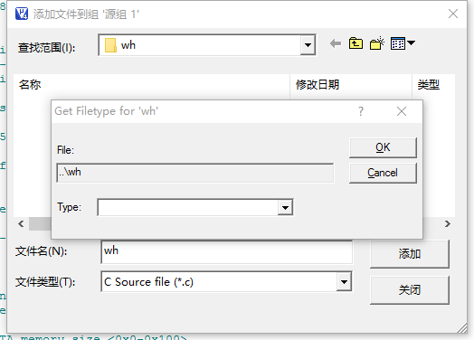 不知道你解决了吗。 从这个界面来看是要获取'wh'的文件类型,你应该在那个Type的下拉框里选择你要添加的文件类型(也就是扩展名)。顺便告诉你那个文件路径是 ..\wh ,".."表示上级目录 所以..\wh表示的就是上级目录下的wh文件。.\wh 的"."表示当前目录,同理。 |