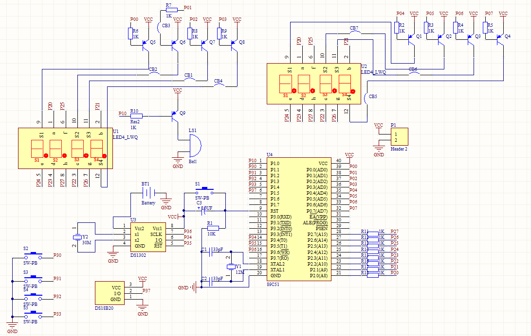 本帖最后由 zl2168 于 2016-11-12 13:04 编辑 除1302的晶振频率不对(应32768Hz)外,电原理图本身无错. 但晶振频率不对不会影响数码管显示,估计是程序问题。数码管显示电路连接正确,共阳数码管,PNP管低电平驱动。 给你2个案例参考: 实例56 PNP晶体管选通3位共阳LED数码管动态显示 实例93 具有校正功能的时钟1302(LED数码管显示) |