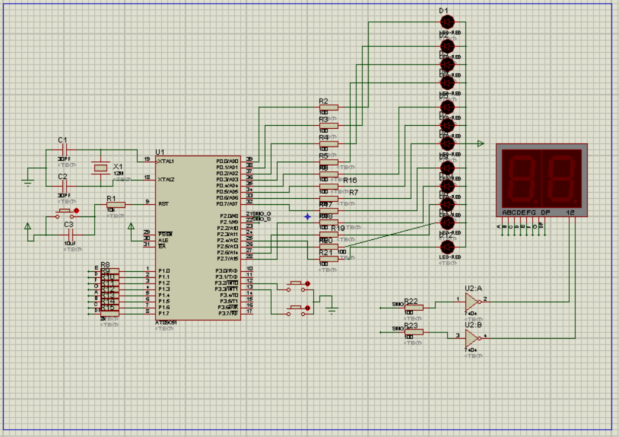 LZ,原理图有误啊,看 LED 那里这样连接能正常工作吗?数码管与 P1 口也没对应好,应为EAFGDBC,DP 源码里的 0x8f 改为 0x9d |