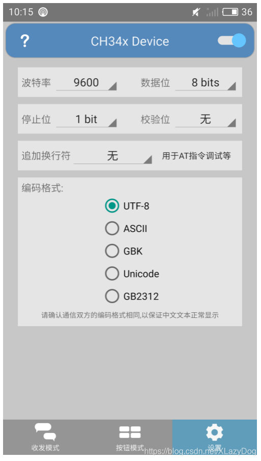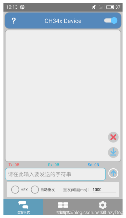 收发模式: 备齐了上述两个法宝之后,就可以进行串口调试了。将上述的两个设备连接到手机上,然后点开应用“串口调试工具”,就可进入下方画面: